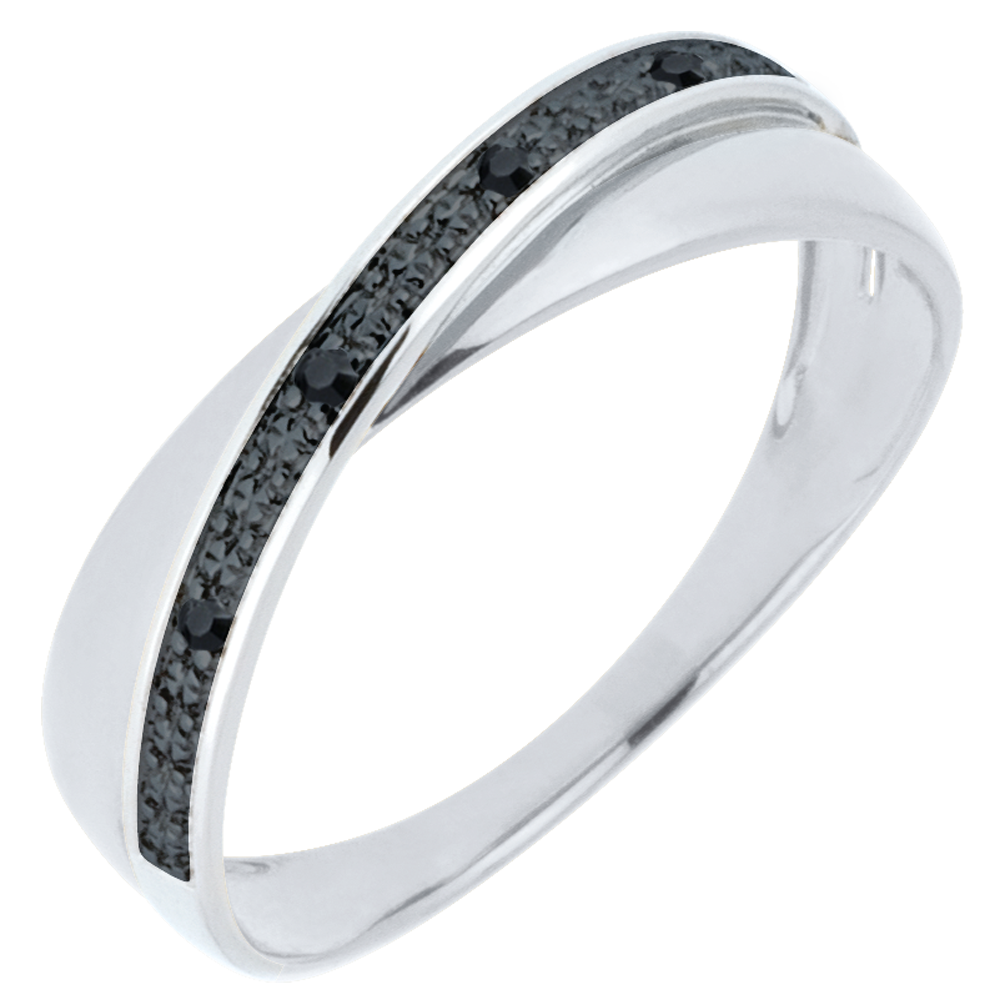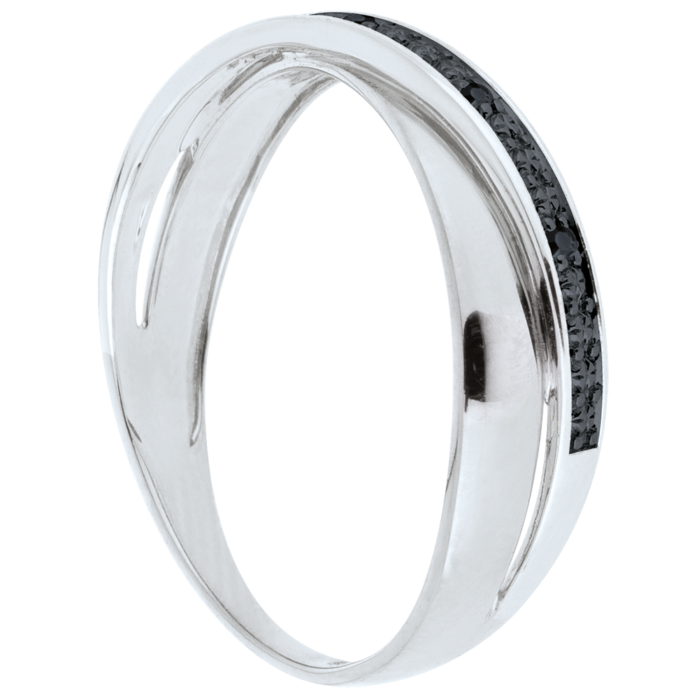 Obrączka ze złota przecięta obrączką wysadzaną czarnymi diamentami. Niepowtarzalna i wyjątkowa obrączka ślubna.
