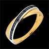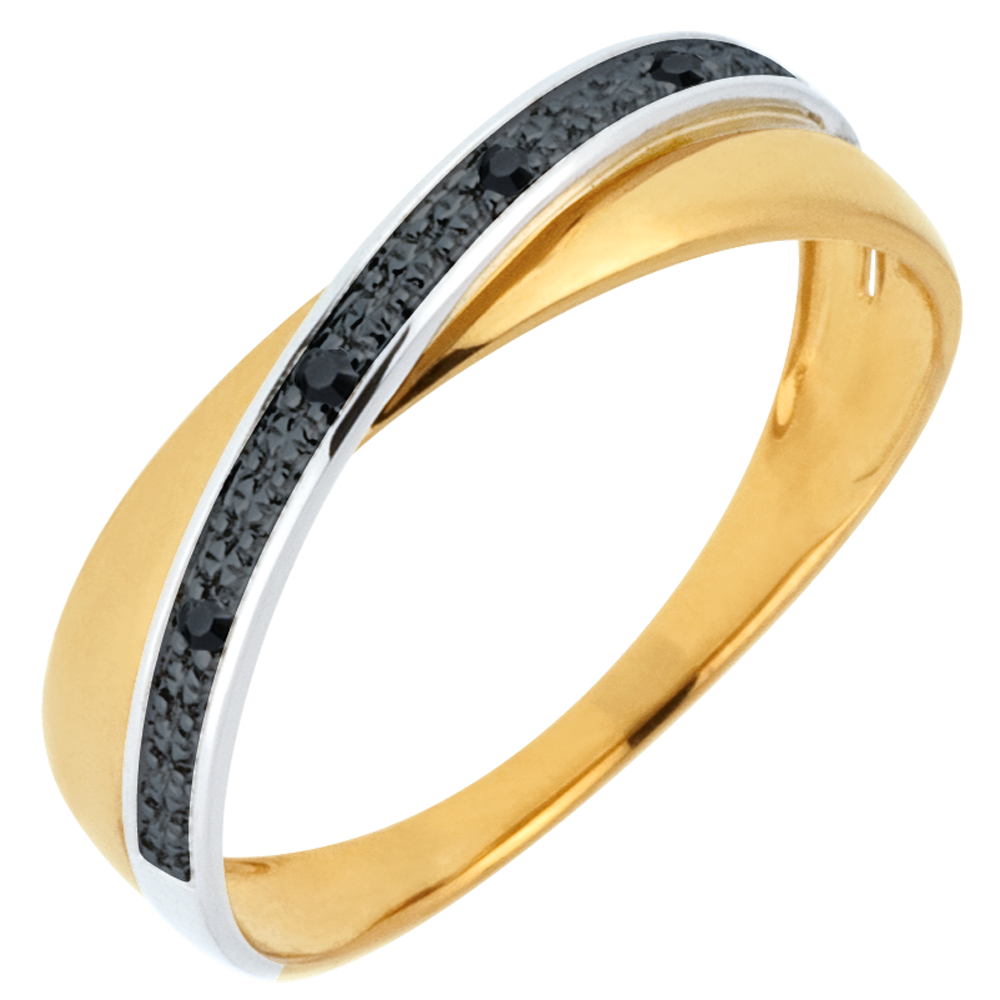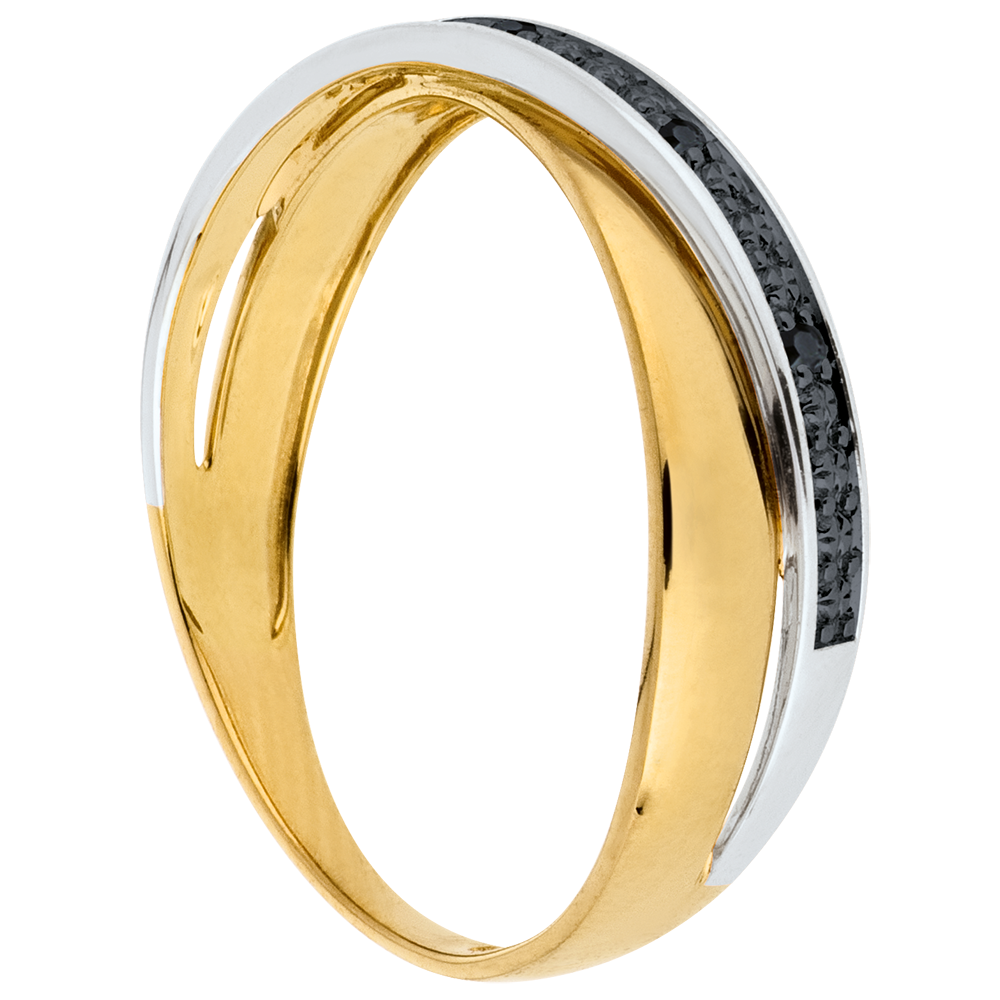 Obrączka z żółtego złota przecięta obrączką z białego złota wysadzaną diamentami o szlifie brylantowym.