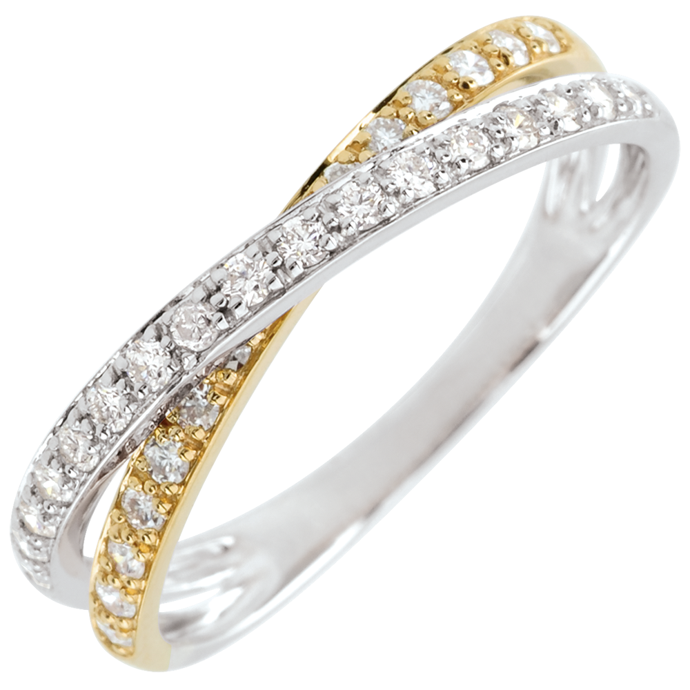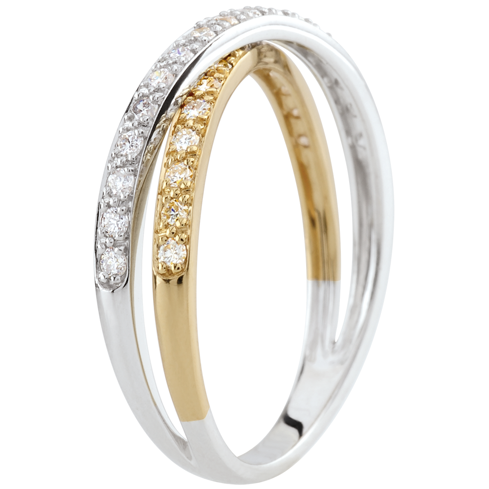 Dwie obrączki z różnych rodzajów złota i diamentów wdzięcznie połączone w jedną.