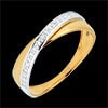 Obrączka z żółtego złota przecięta obrączką z białego złota wysadzaną diamentami o szlifie brylantowym.