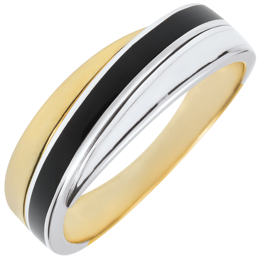 Wyjątkowy pierścionek uzyskany z połączenia czarnej laki, białej laki i żółtego złota. Klasyczny, ponadczasowy zestaw w zupełnie unowocześnionej odsłonie dzięki użyciu czarnej i białej laki.