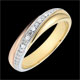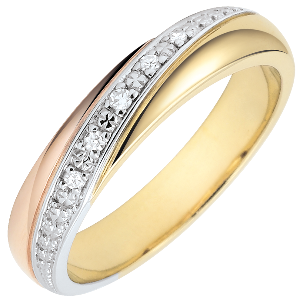 Niepowtarzalna i ponadczasowa, wyważona obrączka w trzech kolorach: białym, żółtym i różowym, podkreślona diamentami.