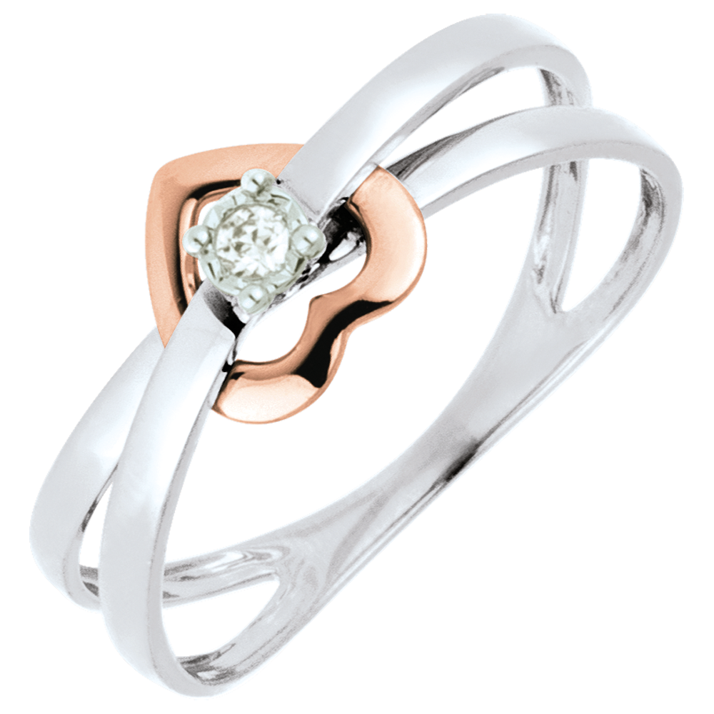 Serce z różowego złota między dwoma obrączkami z białego złota i diamentem osadzonym w białym złocie.