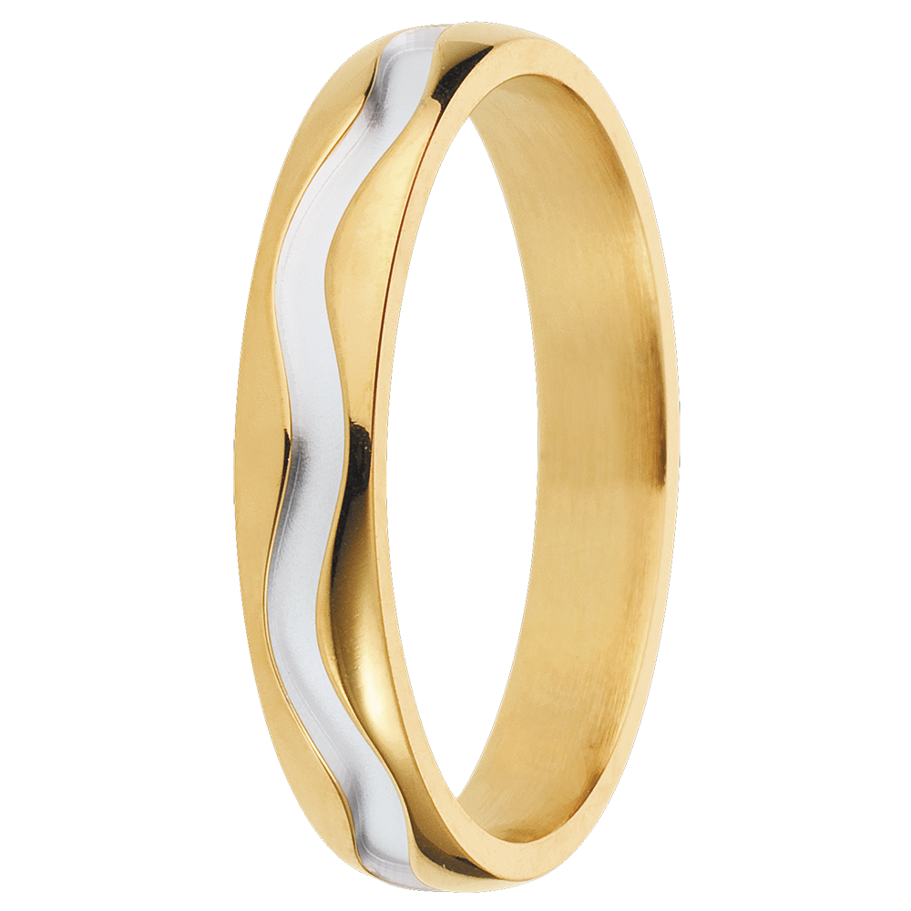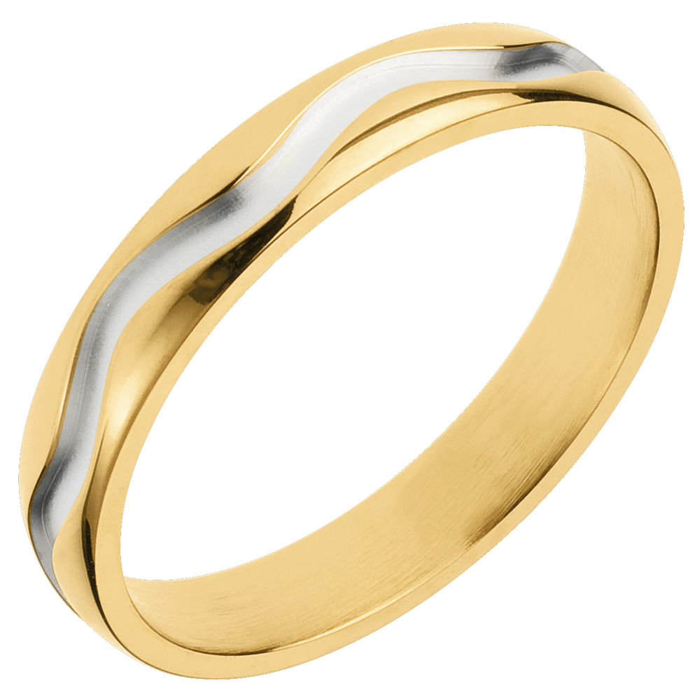 Obrączka z żółtego złota przecięta sinusoidalną linią z białego złota