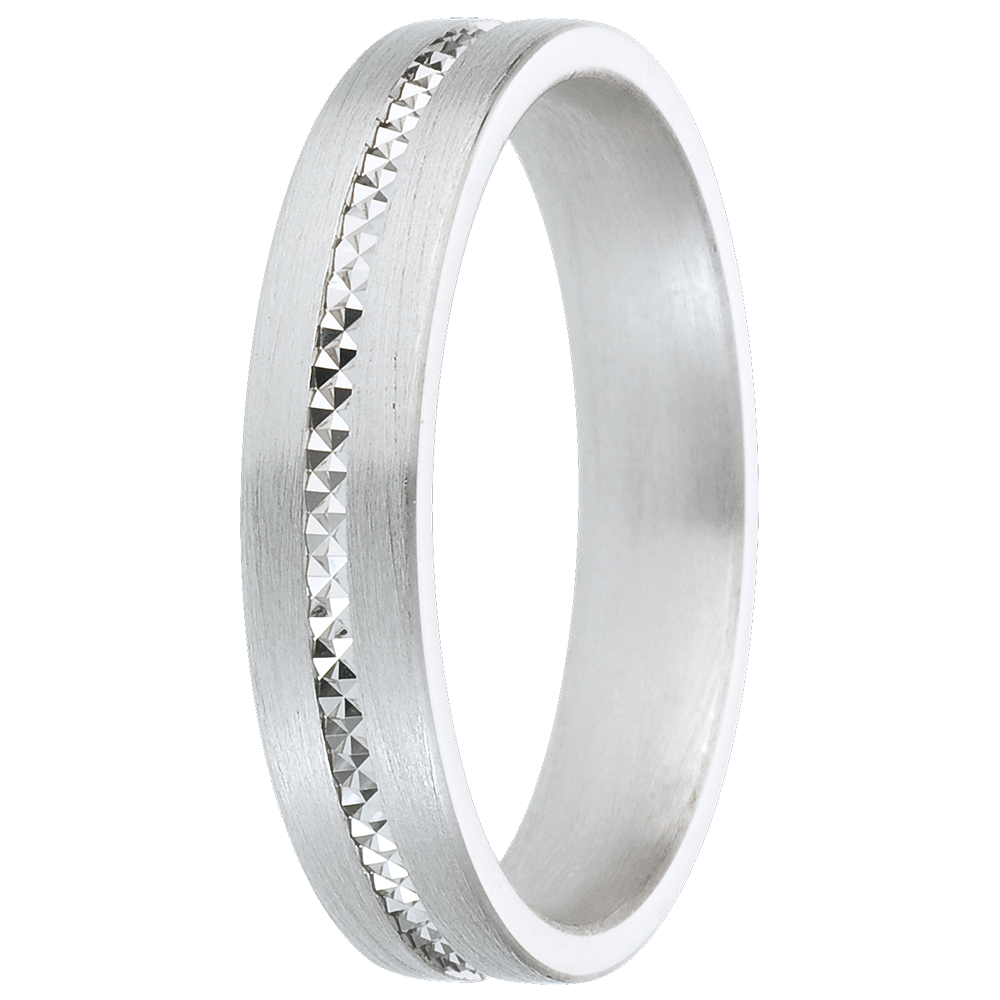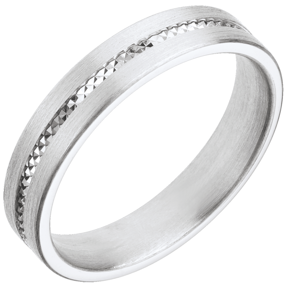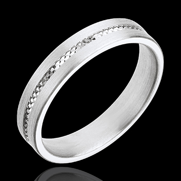 Obrączka z białego złota otoczona grawerunkiem przypominającym ślad pozostawiony na śniegu.