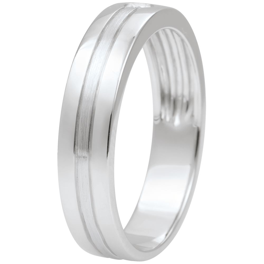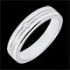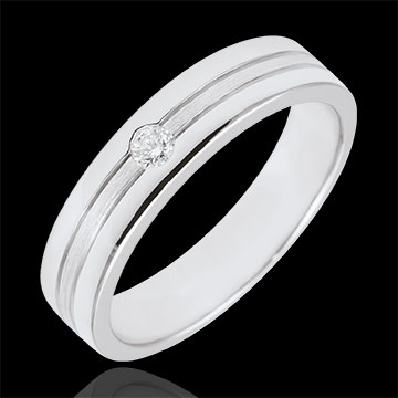 Obrączka z białego złota ozdobiona diamentem środkowym i otoczona paskiem ze szczotkowanego złota dla uzyskania efektu błyszczącego i matowego wynikającego z połączenia dwóch materiałów.