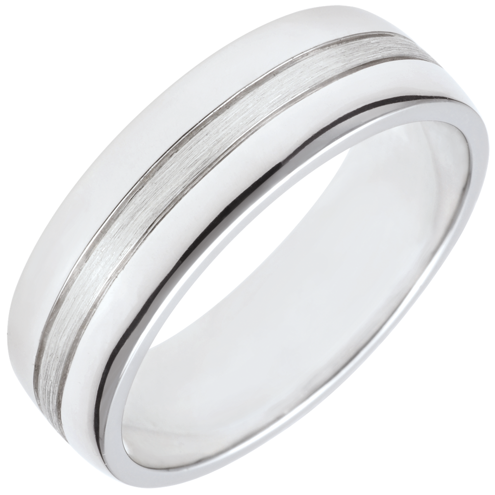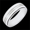 Szeroka obrączka z białego złota otoczona paskiem ze szczotkowanego złota dla uzyskania efektu błyszczącego i matowego wynikającego z połączenia dwóch materiałów.