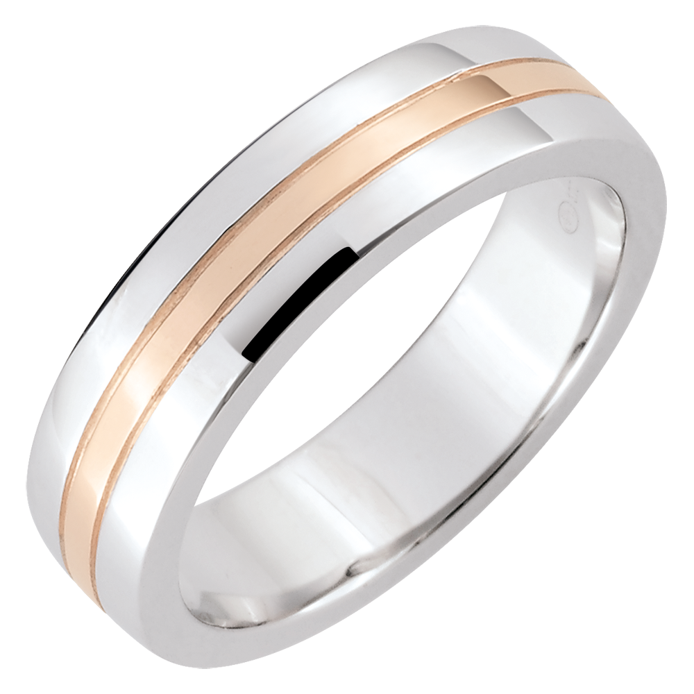 Obrączka z białego złota otoczona paskiem z różowego złota dla uzyskania nowoczesnego błyszczącego efektu.