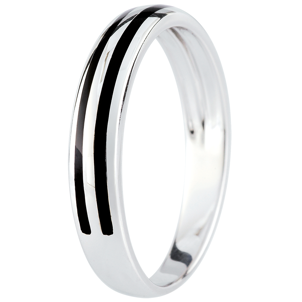 Nowoczesna, męska obrączka Światłocień z zaokrąglonego złota przecięta dwoma paskami z czarnej laki.