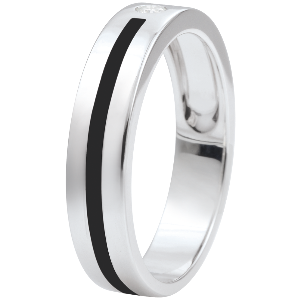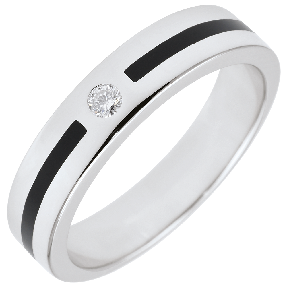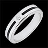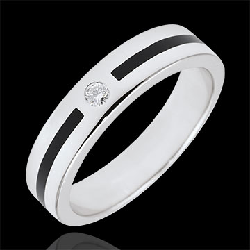 Obrączka Światłocień z białego złota ozdobiona diamentem środkowym i otoczona paskiem laki o głębokiej czerni.