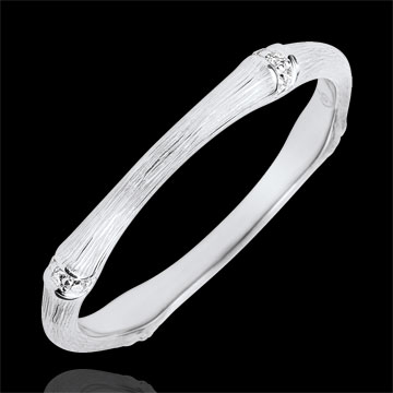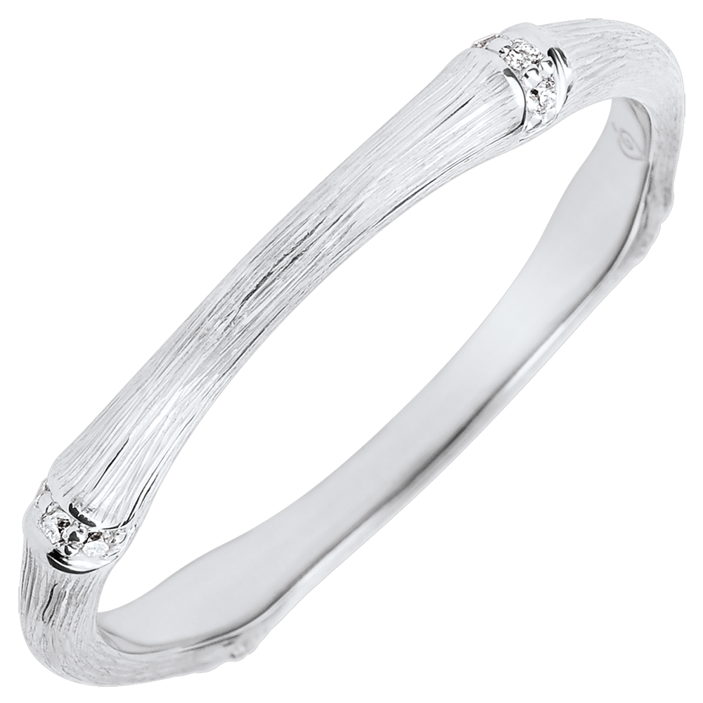 Elastyczna i trwała bambusowa tyczka przeobrażona w wieczną obrączkę z szczotkowanego białego złota wysadzaną diamentami. Wykonane ręcznie wykończenie matowe nadaje obrączce ujmujący naturalny i realistyczny wygląd.