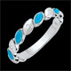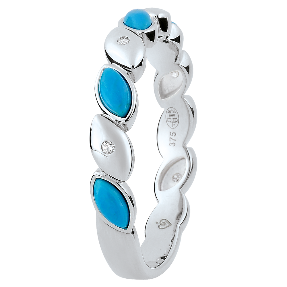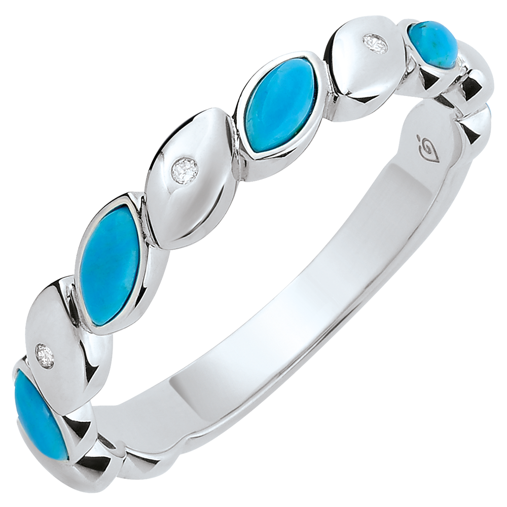 Nowoczesna obrączka z białego złota łącząca z wyrafinowaniem turkusowe łezki z diamentami. Obrączkę można również nosić jako wyjątkowy pierścionek.