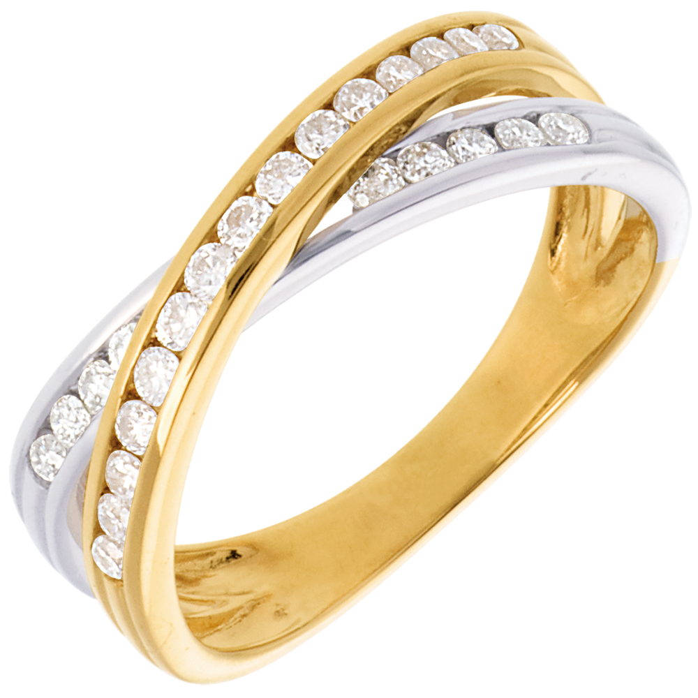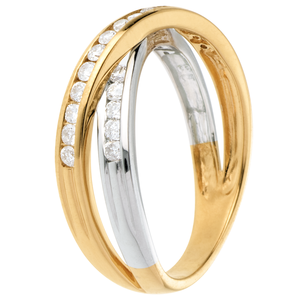 Tandem eliptycznych obrączek z białego i żółtego złota wysadzanych diamentami, symbolizujących związek i doskonałą harmonię.