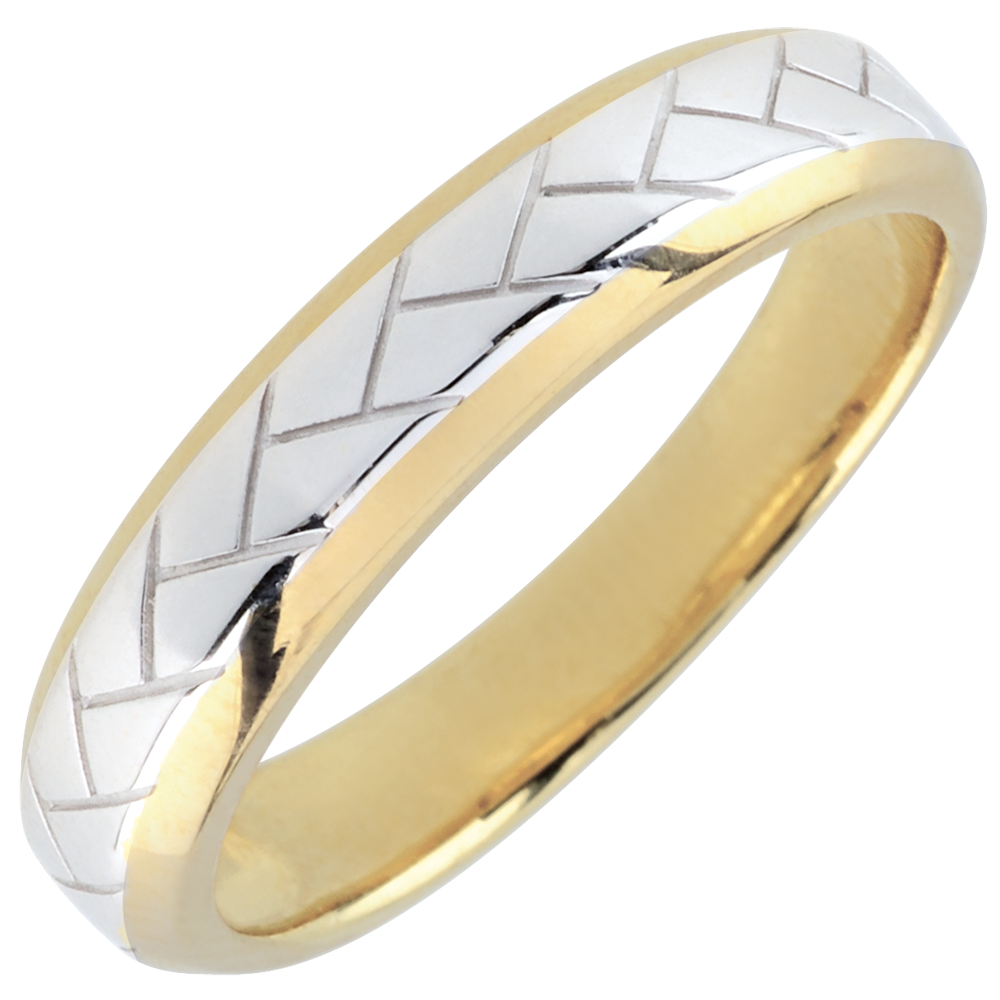 Obrączka z żółtego złota o ściętych brzegach utkana z białego złota na środku.