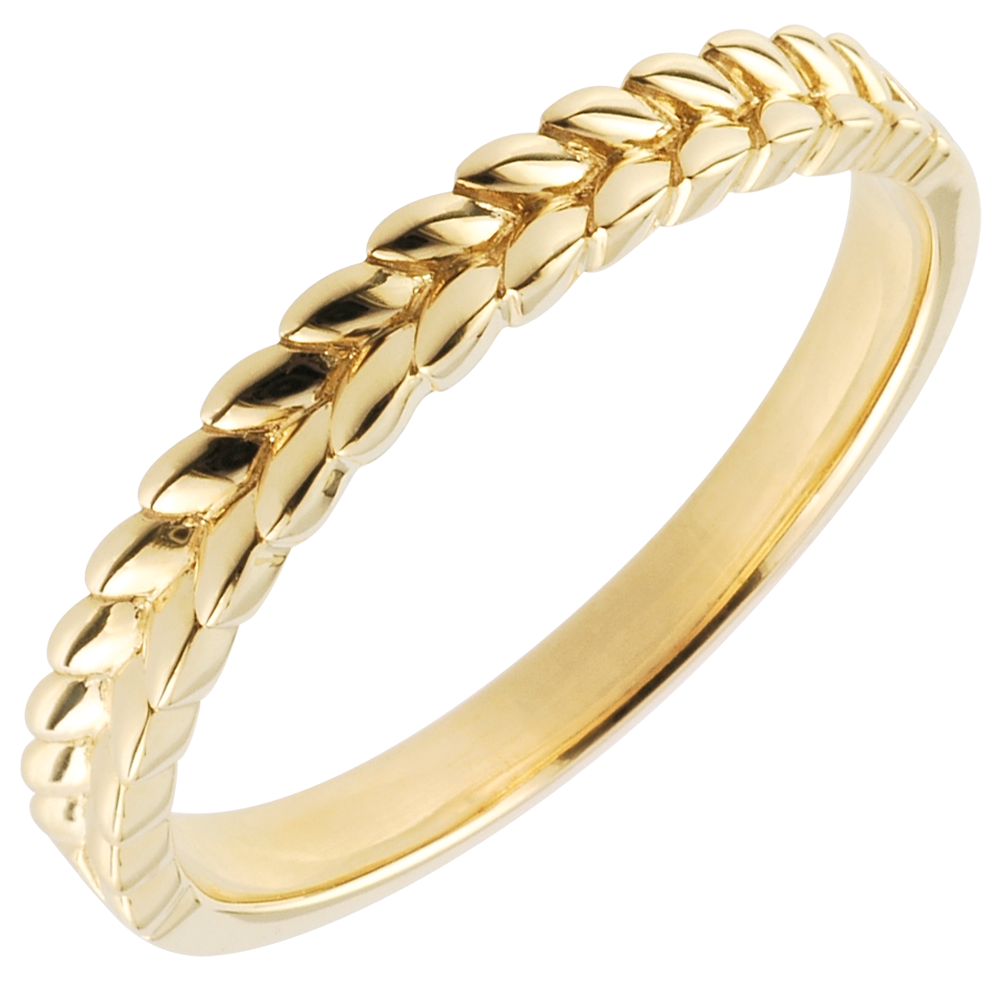 Obrączka z plecionych złotych liści na połowie pierścionka. Oryginalna i wyrafinowana obrączka ślubna lub obrączka do łączenia z innymi pierścionkami.
