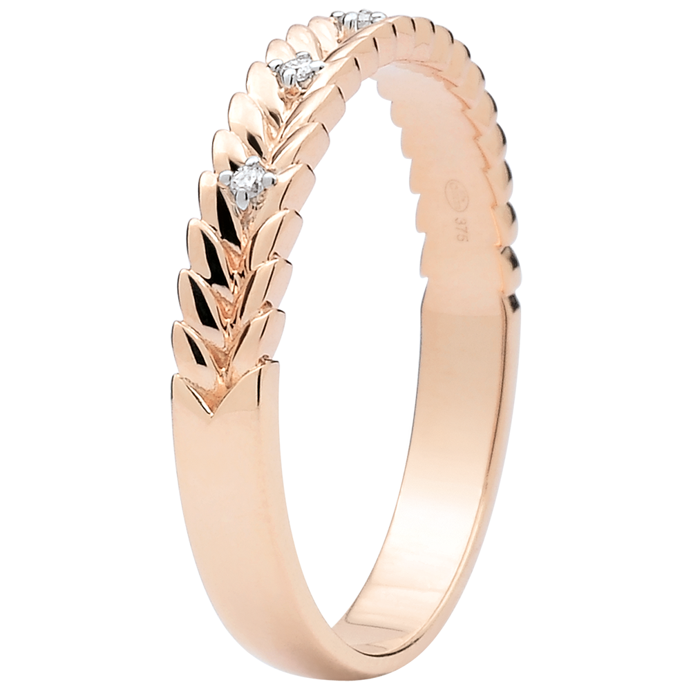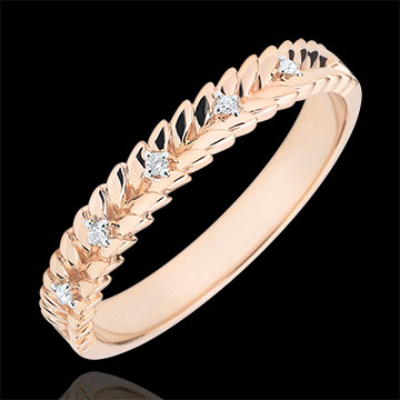 Delikatne diamenty wsunięte w splot złotych liści na obrączce z różowego złota.