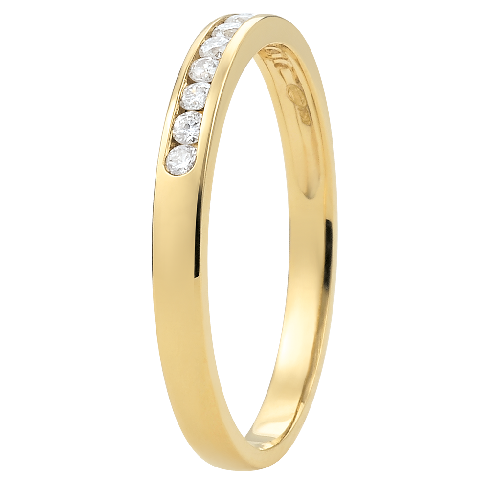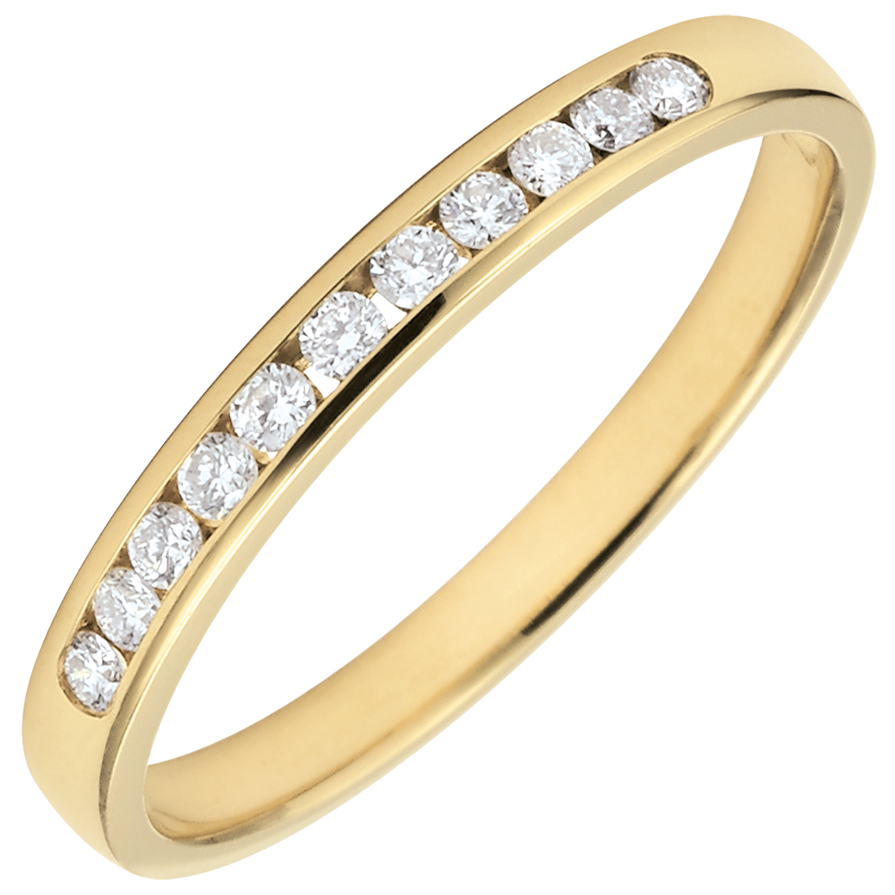 Doskonała równowaga w obrączce z żółtego złota o wyrazistej symbolice, wysadzanej 11 okrągłymi diamentami w oprawie kanałowej. Niezastąpiona ozdoba jako wyraz wyjątkowej więzi.
