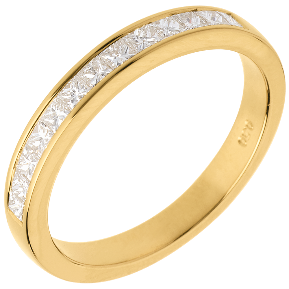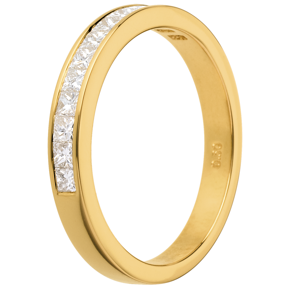 Obrączka o kwadratowym przekroju, w połowie wysadzana diamentami. Diamenty o szlifie „princessa” w oprawie kanałowej.