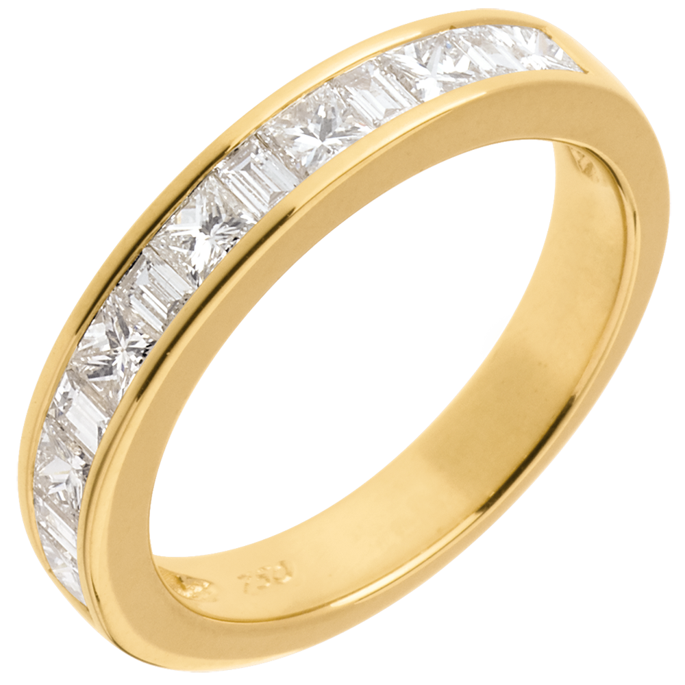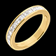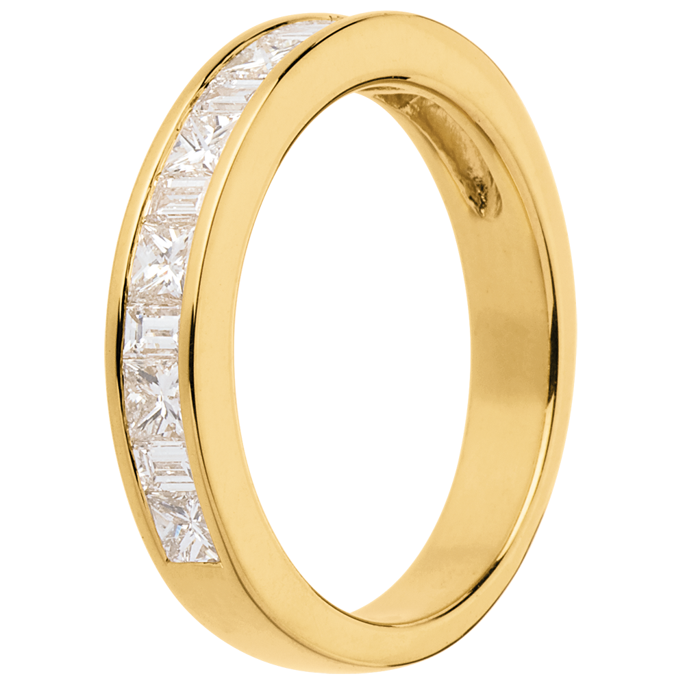 Obrączka o kwadratowym przekroju, w połowie wysadzana diamentami. Diamenty o szlifie „bagieta” i „princessa” w oprawie kanałowej.