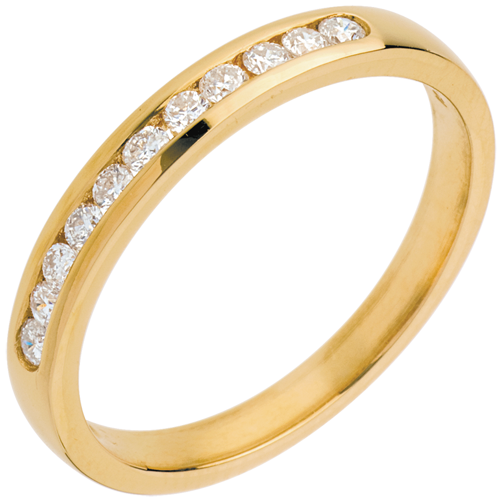 Doskonała równowaga w obrączce o wyrazistej symbolice, wysadzanej okrągłymi diamentami w oprawie kanałowej. Niezastąpiona ozdoba jako wyraz wyjątkowej więzi.