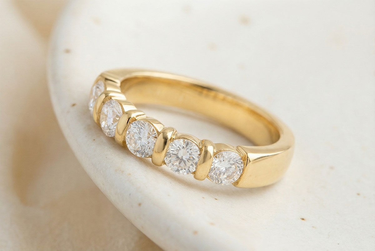 Obrączka z żółtego złota 18-karatowego w połowie wysadzana diamentami - oprawa sztabkowa - 1,2 karata - 6 diamentów