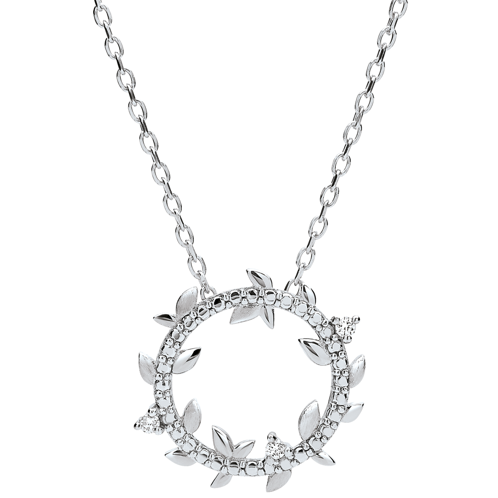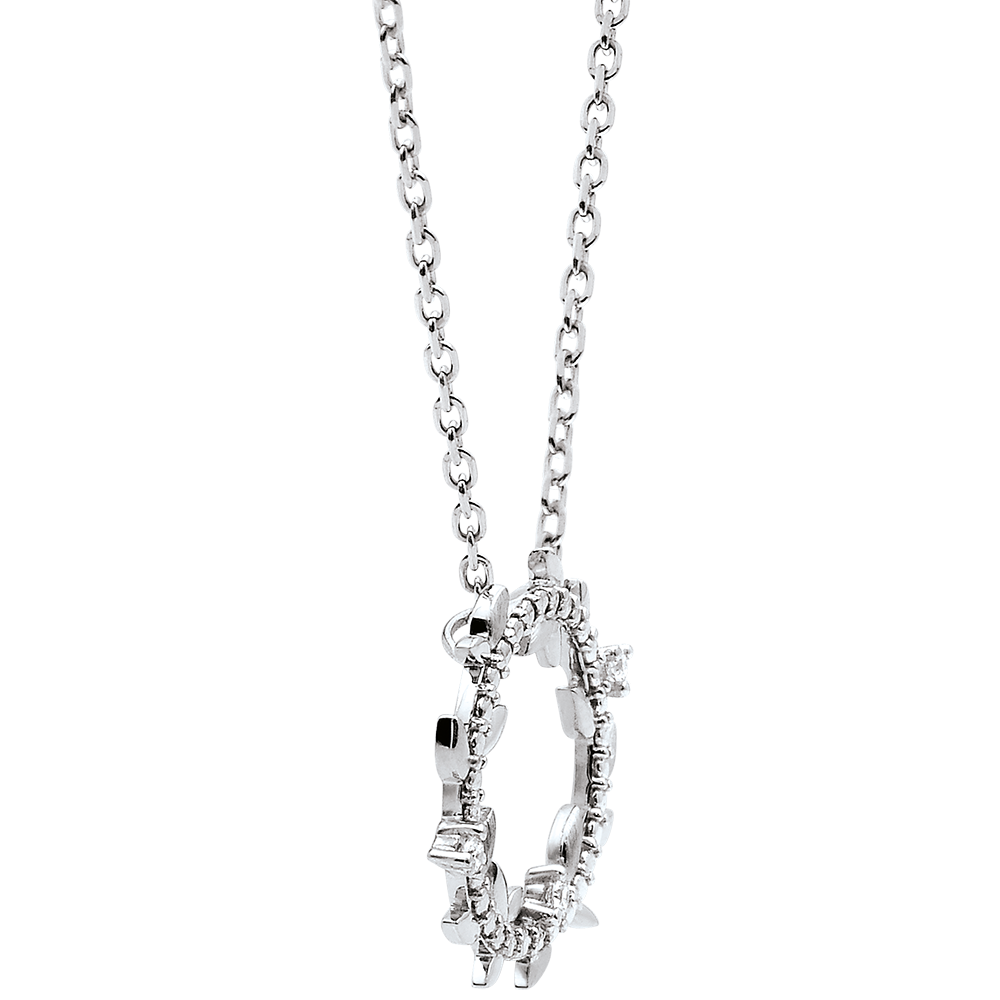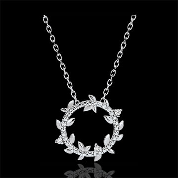 Romantyczny naszyjnik wysadzany 6 diamentami, wykonany naprzemiennie z błyszczących liści z białego złota i z liści ze złota szczotkowanego ręcznie.