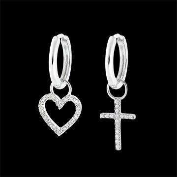 Pojedynczy kolczyk w kształcie koła ozdobiony wisiorkiem z białego złota w kształcie serduszka wysadzanym połyskującymi diamentami. Średnica wisiorka 3,1mm.