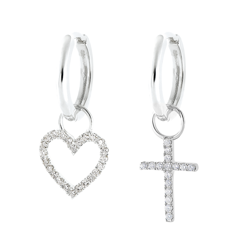 Pojedynczy kolczyk w kształcie koła ozdobiony wisiorkiem z białego złota w kształcie krzyżyka wysadzanym połyskującymi diamentami. Średnica wisiorka 3,1mm.