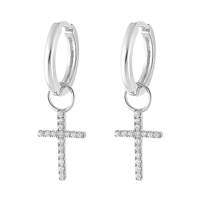Pojedynczy kolczyk w kształcie koła ozdobiony wisiorkiem z białego złota w kształcie krzyżyka wysadzanym połyskującymi diamentami. Średnica wisiorka 3,1mm.