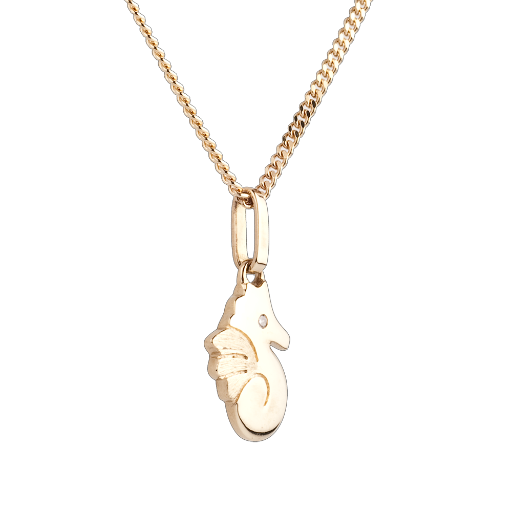 Mały konik morski z żółtego złota o zaokrąglonych kształtach i okiem z diamentu. Duży model.