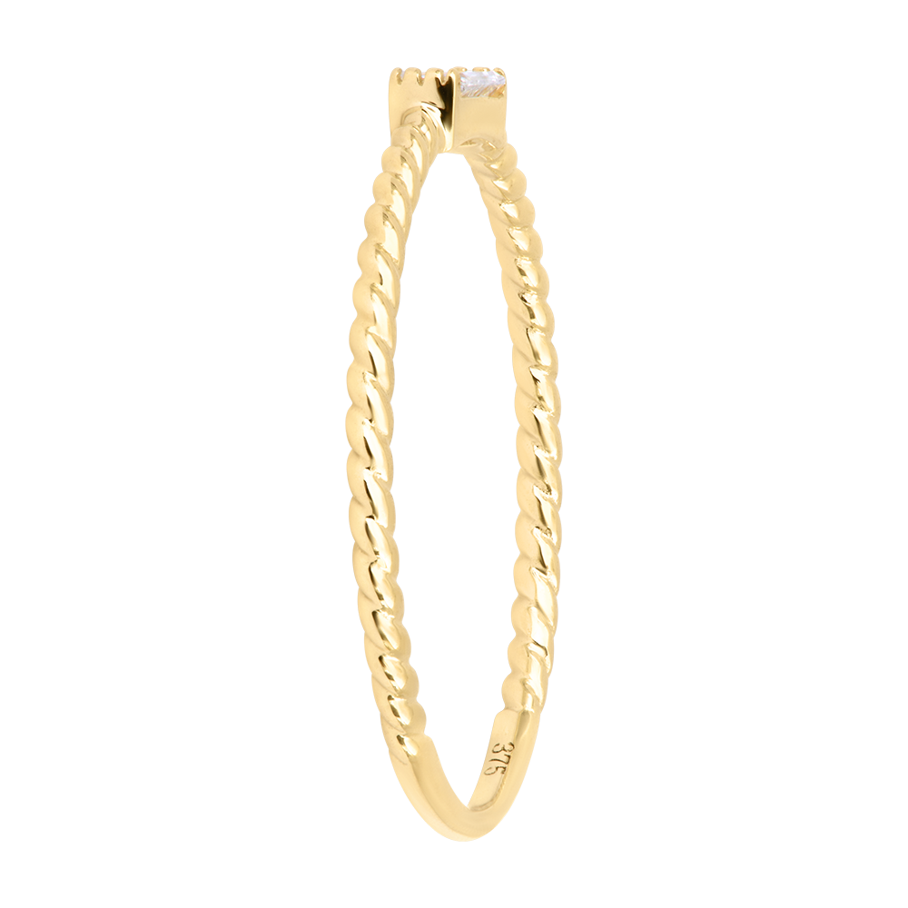 Prostokątny diament syntetyczny umieszczony na subtelnie skręconej obrączce.Minimalistyczny i elegancki pierścionek – idealny na co dzień, by dodać odrobinę blasku.