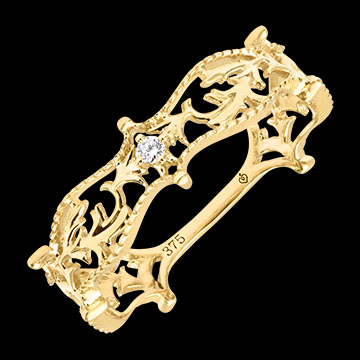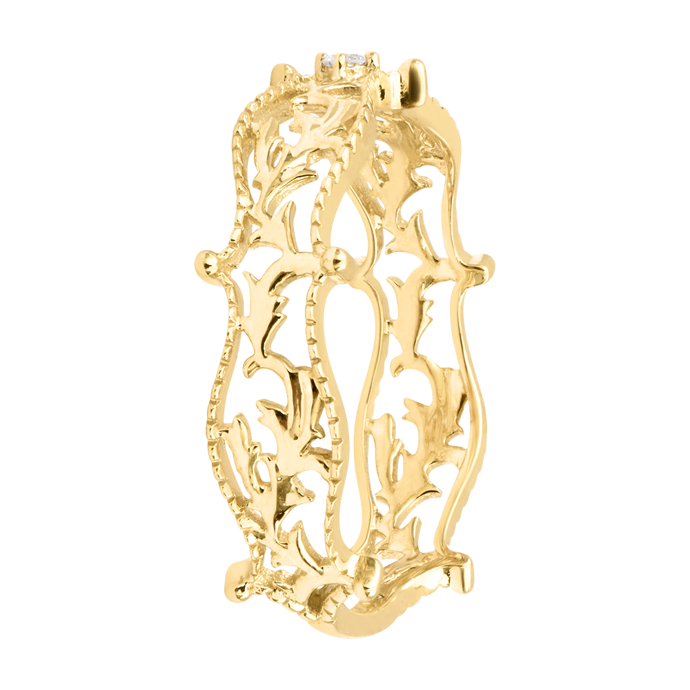 Delikatna, misternie rzeźbiona koronka z liści oplata palec niczym roślinna korona ze złota. W centrum lśni pojedynczy, syntetyczny diament. Poetycki, organiczny i szlachetny pierścionek inspirowany pięknem natury.