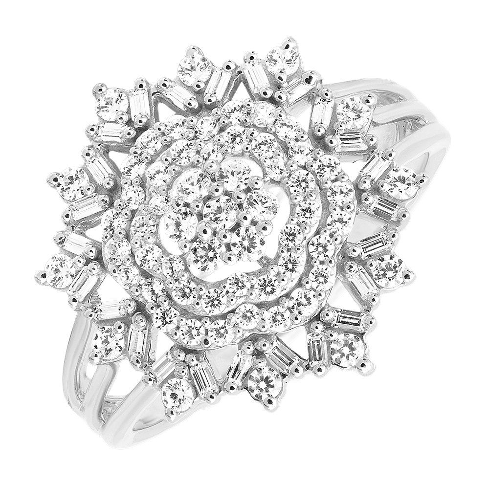 Jego wzór przypomina rozświetlony ogród, gdzie każdy diament łapie światło, tworząc harmonijny i trwały połysk. Cenny klejnot, który subtelnie podkreśla kobiecość.