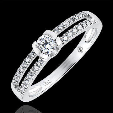 Szlachetny, pełen blasku, elegancki pierścionek podkreślający mistykę diamentu na oprawie wykonanej z dwóch rzędów diamentów.
