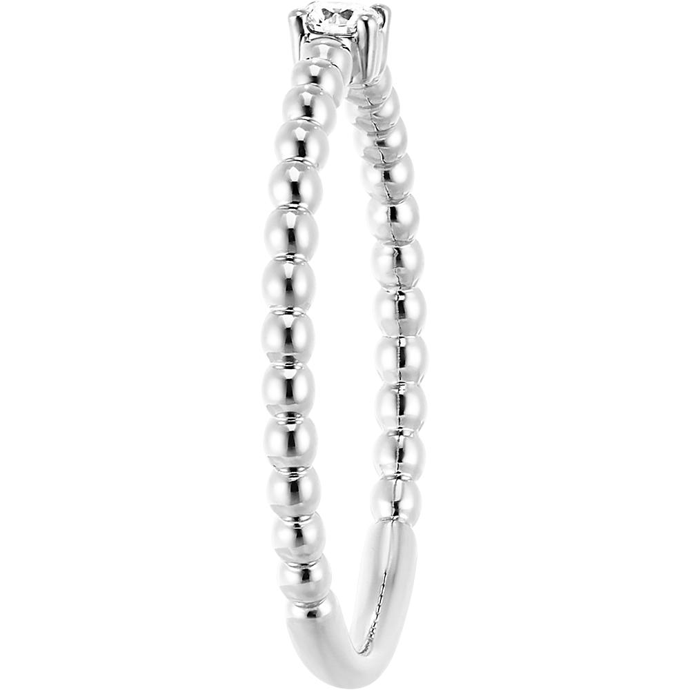 Pojedynczy diament zakuty w 4 krapach i umieszczony w towarzystwie niezliczonej ilości złotych perełek. Subtelny i ponadczasowy pierścionek zaręczynowy.