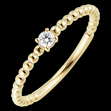 Pojedynczy diament zakuty w 4 krapach i umieszczony w towarzystwie niezliczonej ilości złotych perełek. Subtelny i ponadczasowy pierścionek zaręczynowy.