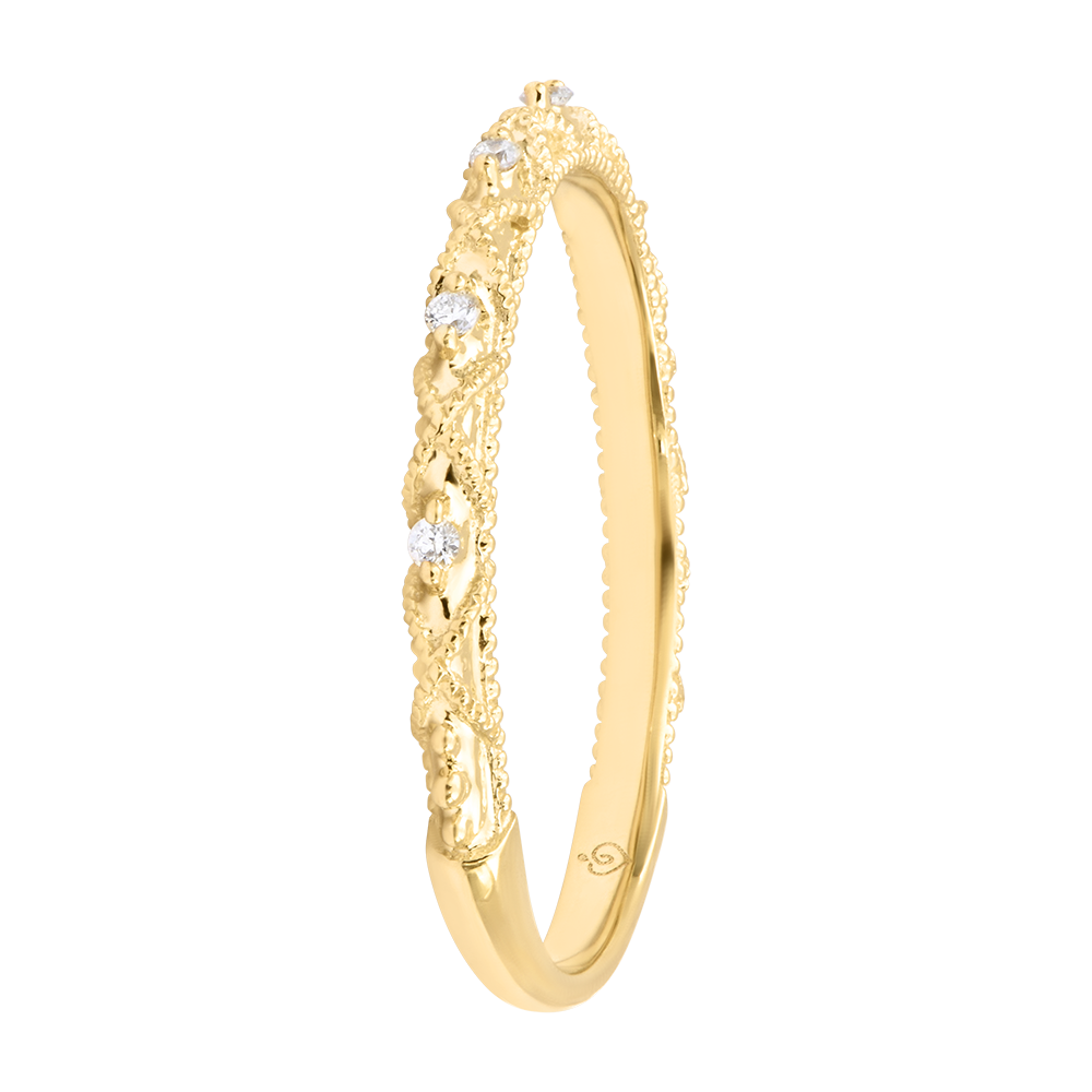 Delikatny splot złota ozdobiony siedmioma lśniącymi diamentami syntetycznymi.Subtelna, olśniewająca biżuteria, jak szeptana obietnica trzymana w dłoni.