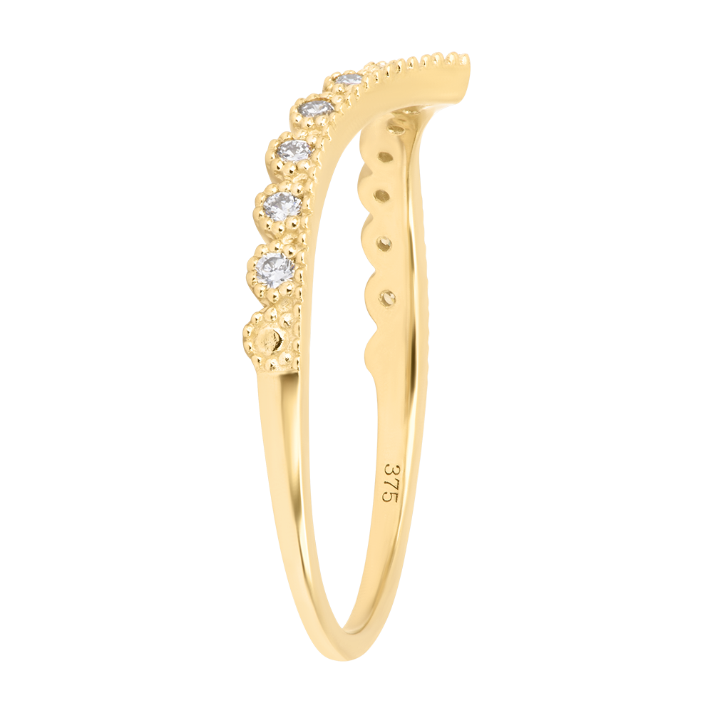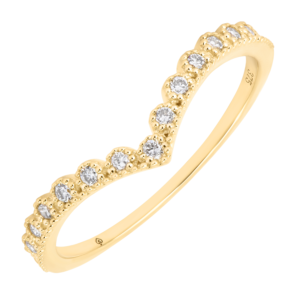 Trzynaście diamentów tworzy linię w kształcie litery V, podkreślając krzywiznę palca blaskiem i precyzją.Olśniewająca, geometryczna obrączka stworzona, by podkreślić pierścionek zaręczynowy lub zachwycać samodzielnie.