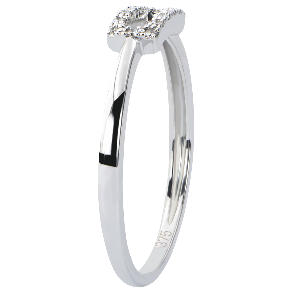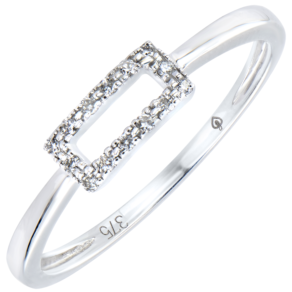 Minimalistyczna graficzna oprawa składająca się z ażurowego prostokąta wysadzanego diamentami. Nowoczesny pierścionek do noszenia na co dzień.