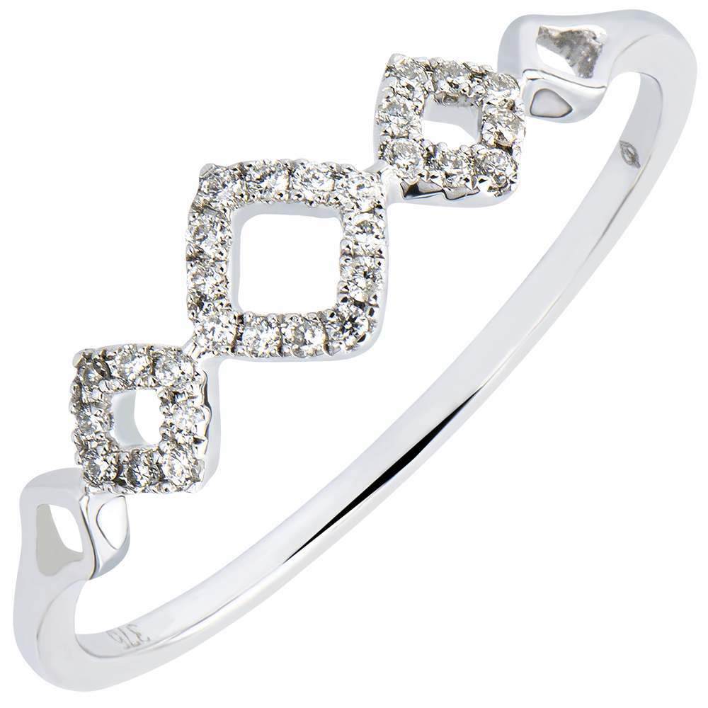 Delikatny zestaw rombów wysadzanych diamentami tworzących subtelną i wyrafinowaną ozdobę na palcu.