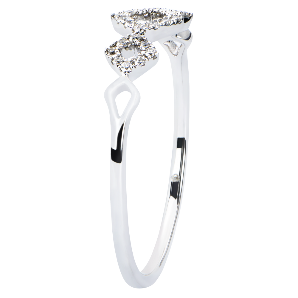 Delikatny zestaw rombów wysadzanych diamentami tworzących subtelną i wyrafinowaną ozdobę na palcu.