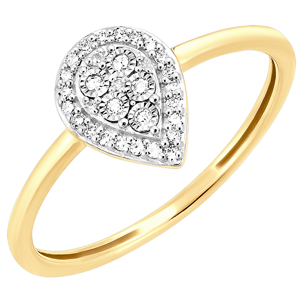 Blask diamentu w kształcie łezki, otoczonego diamentową aureolą i delikatnie osadzonego na szynie z żółtego złota. Szlachetny i subtelny pierścionek z białego i żółtego złota emanujący ponadczasową elegancją.