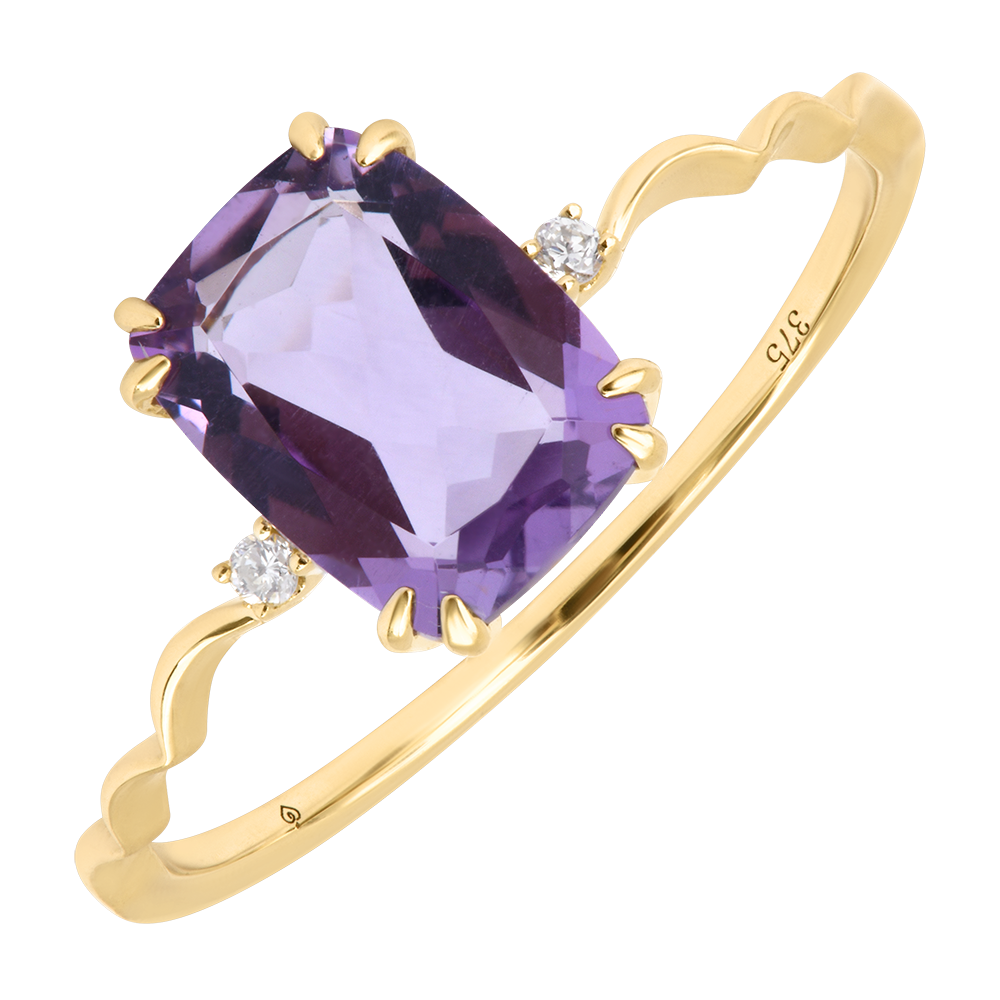 Pierścionek Vespera prezentuje wyrazisty, 2-karatowy ametyst osadzony w złocie żółtym 9 karatów, otoczony dwoma delikatnymi diamentami syntetycznymi. Ten słoneczny klejnot łączy tajemnicę zmierzchu z wiecznym blaskiem dzięki purpurowym refleksom.