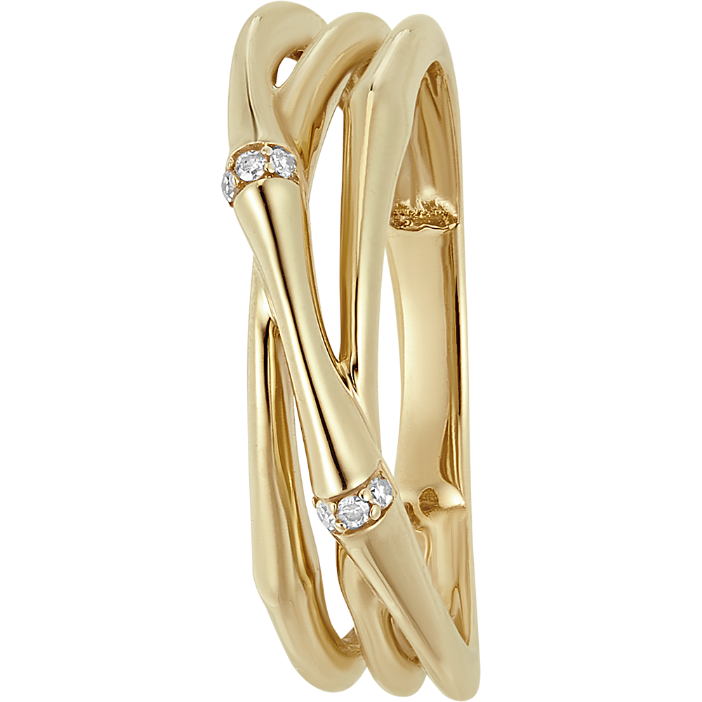 Przeplatająca się giętka bambusowa łodyga zamienia się w ponadczasowy pierścionek ze złota. „Bambusowe” węzły zostały wysadzone diamentami.