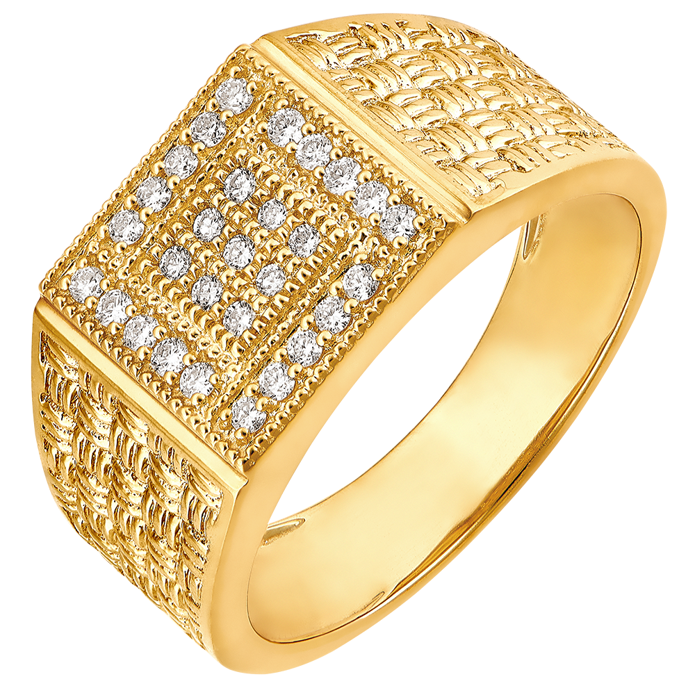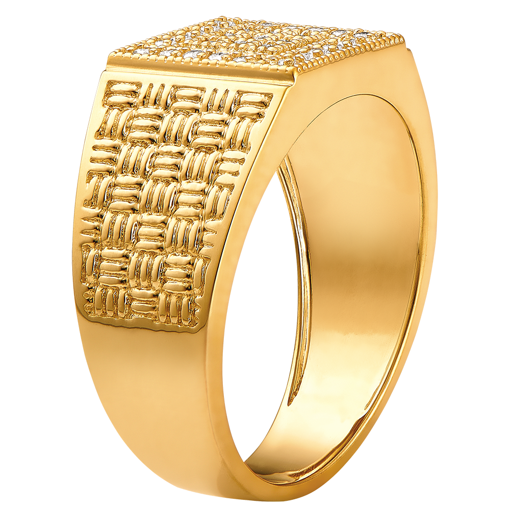 Sygnet z plecionym motywem z żółtego złota, pośrodku z kwadratową podstawą, bogato wysadzany 29 diamentami. Delikatny i jednocześnie imponujący klejnot.