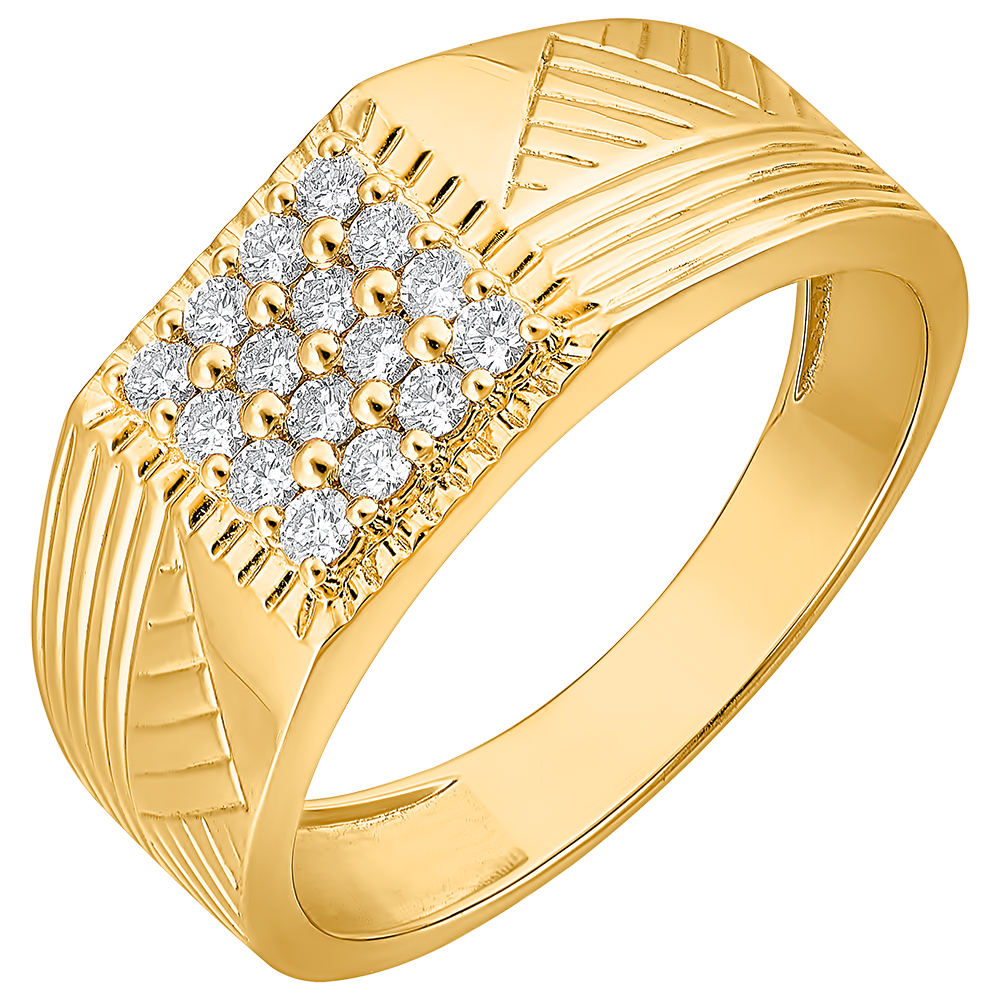 Sygnet z żółtego złota z motywem delikatnego grawera, pośrodku bogato wysadzany 16 diamentami.