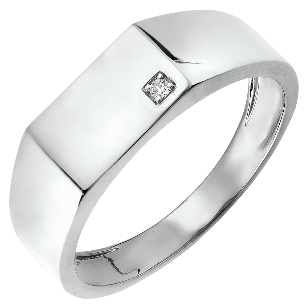 Sygnet z białego złota, pośrodku z prostokątną podstawą oprawioną połyskującym diamentem. Zdecydowanie nowoczesny model.