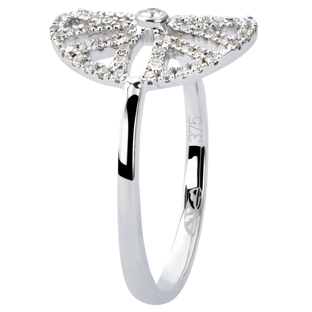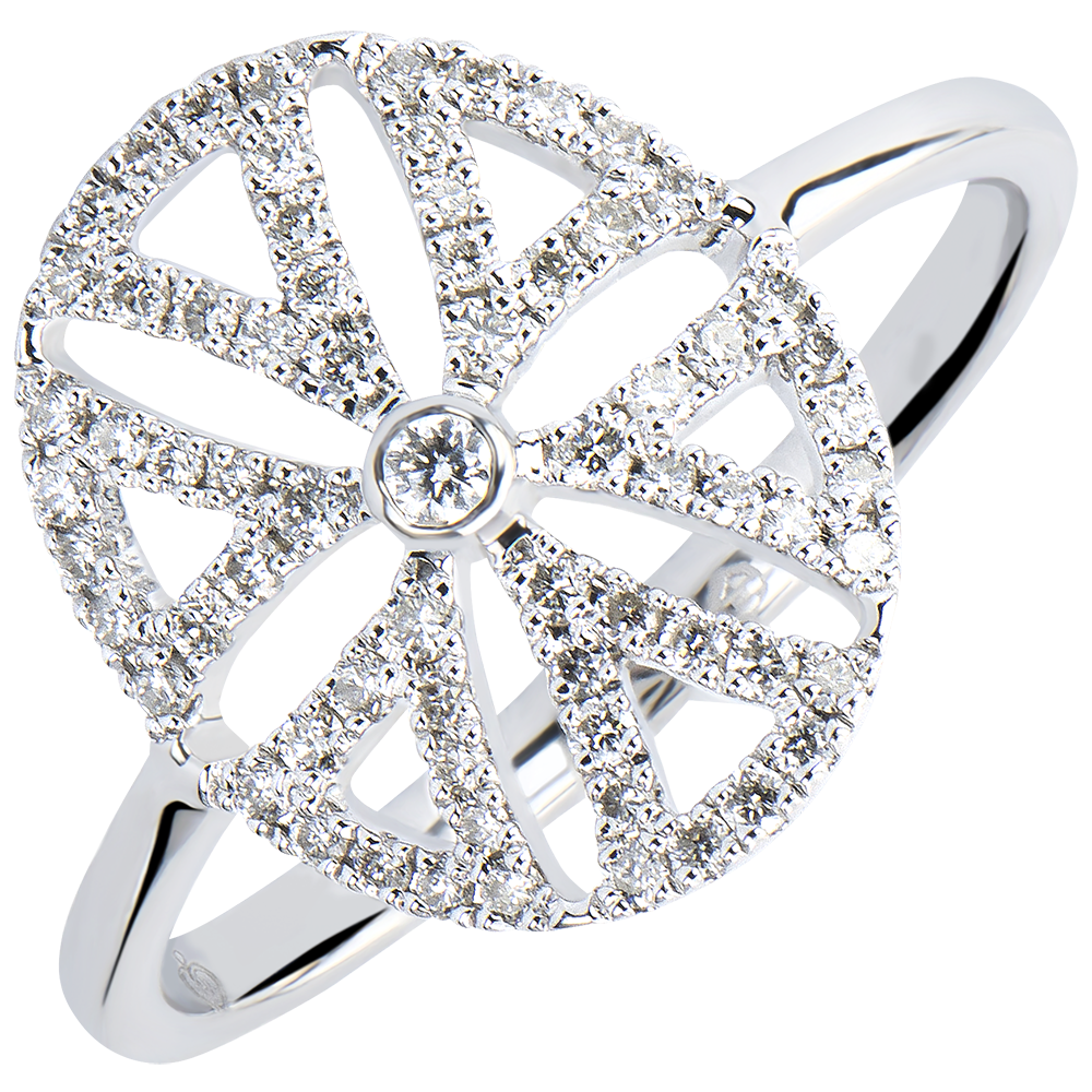 Kwiatowy wzór w nowej odsłonie opartej na graficznej i nowoczesnej formie w ażurowym pierścionku o konturach wysadzanych diamentami. Kreatywny i wyrafinowany model.
