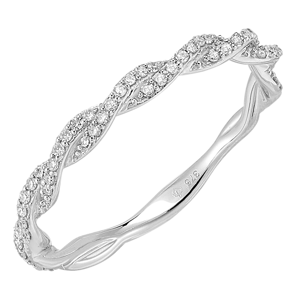 Pierścionek, w którym dwa splecione pasemka z białego złota wysadzanego diamentami odzwierciedlają trwający na wieczność uścisk.