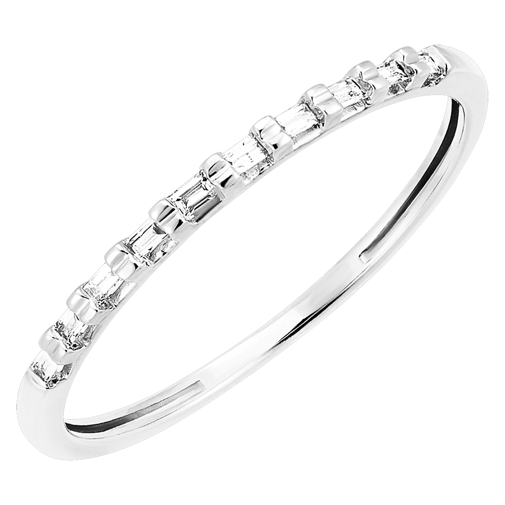 Pierścionek z białego złota wysadzany diamentami o szlifie szmaragdowym odbija światło, tworząc symfonię refleksów i olśniewającego blasku.